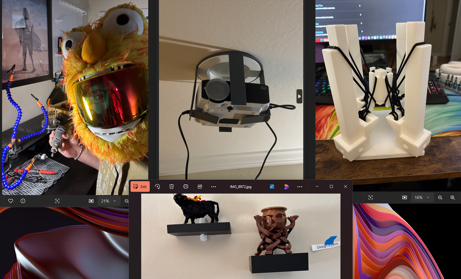 I've been 3D printing for a while now, using Onshape as my CAD software of choice, I design the majority of the things I print so fixes and . Pictured here is my grinding metal off a motor for use in a cat toy, a projector holder that slots into a light in my ceiling, the first rendition of a cat toy that what not exactly what I wanted, and finally the first thing I designed, shelves for childhood knick-knacks I took home after visiting my family. I have printed much more than this, but this is what I took pictures of
